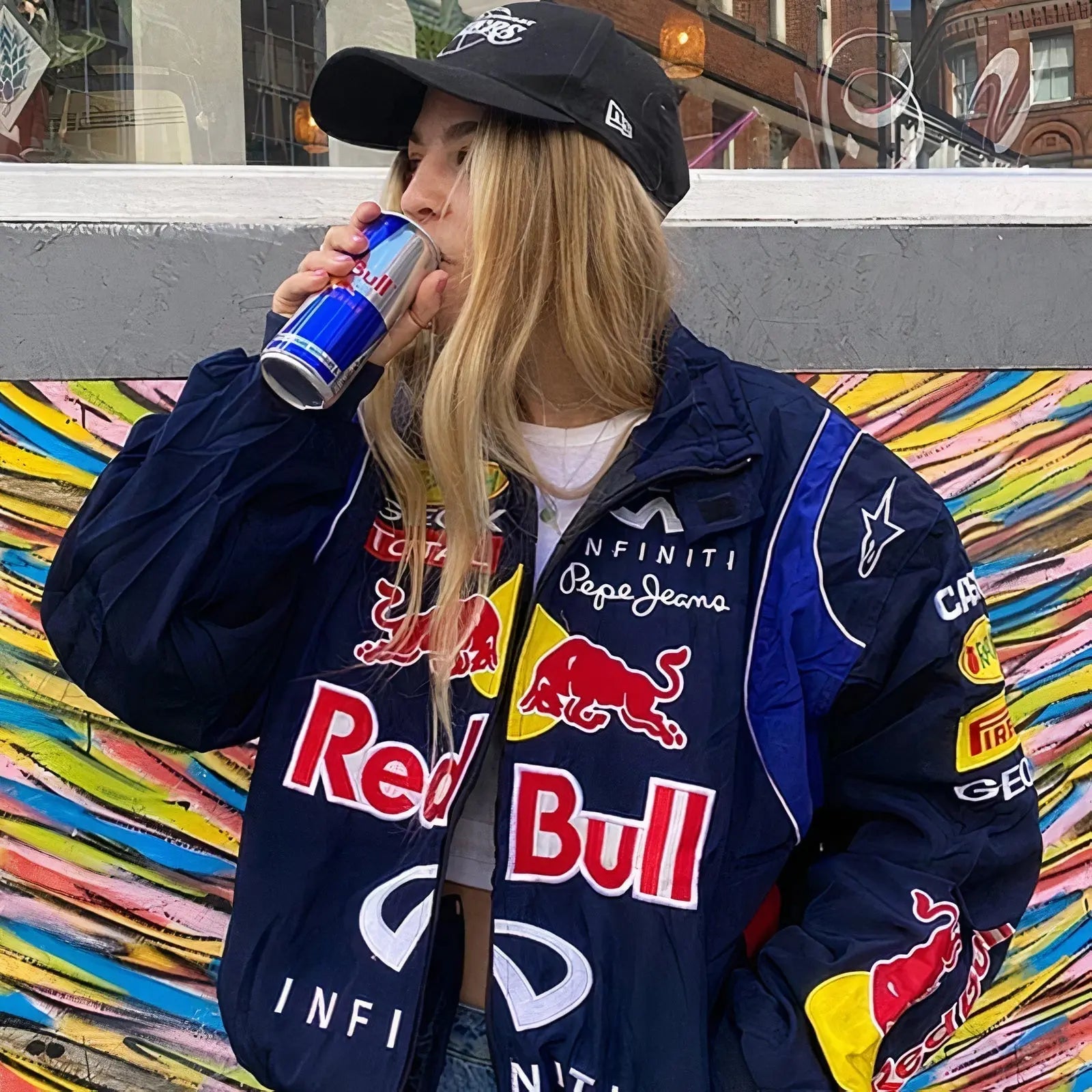 A similar Ferrari racing jacket was famously worn by Lana Del Rey, making this piece not only a fashion statement but also a cultural icon loved by motorsport fans and streetwear collectors alike.
